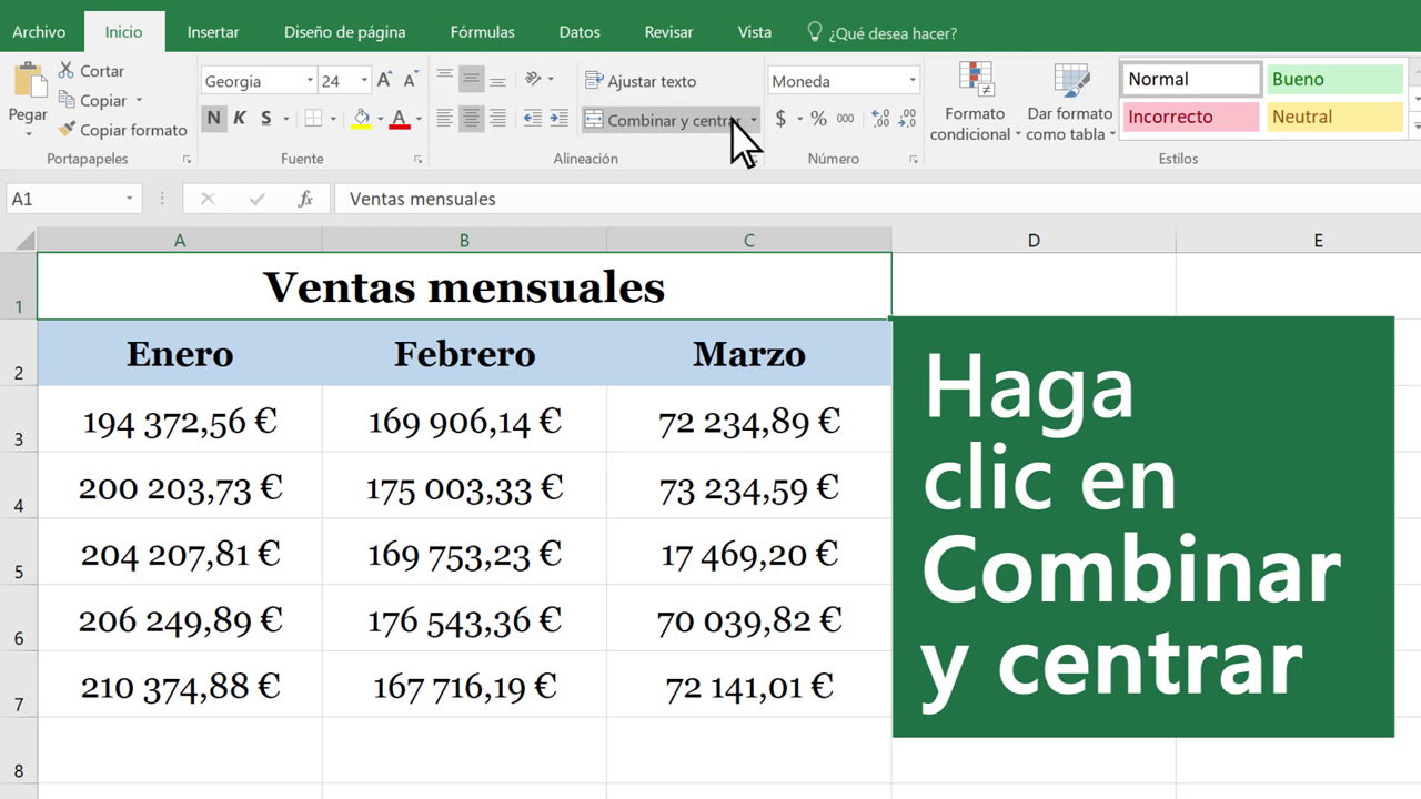0">Aunque ya no está disponible el botón Centrar en varias columnas , se puede Centrar texto en columnas sin combinar celdas. Para ello, siga estos pasos: