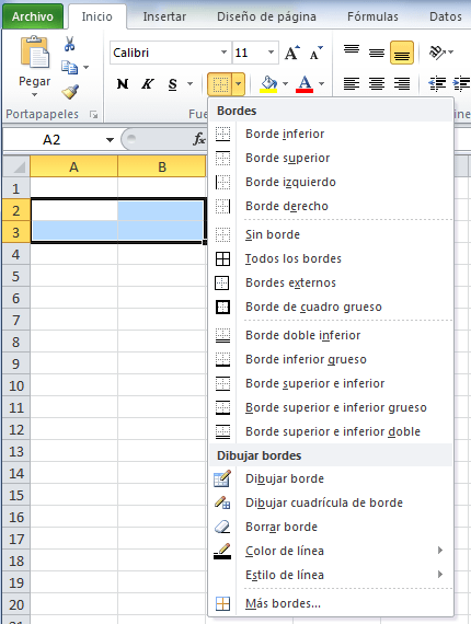 En primer lugar debes seleccionar las celdas a las que se aplicará el formato y hacer clic sobre el botón Bordes que se encuentra en la ficha Inicio dentro del grupo Fuente. Se mostrará un menú con las diferentes opciones de bordes que se pueden aplicar a la selección