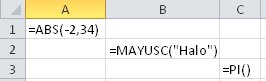 Por ejemplo, la función ABS requiere un número como argumento. La función MAYUSC (que convierte todo el texto en minúscula en texto en mayúscula) requiere una cadena de texto como argumento. La función PI no requiere argumentos porque simplemente devuelve el valor de pi (3,14159...)