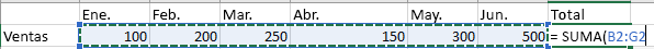 Escriba un signo igual = y luego escriba una función. Por ejemplo, =SUMA para obtener las ventas totales.