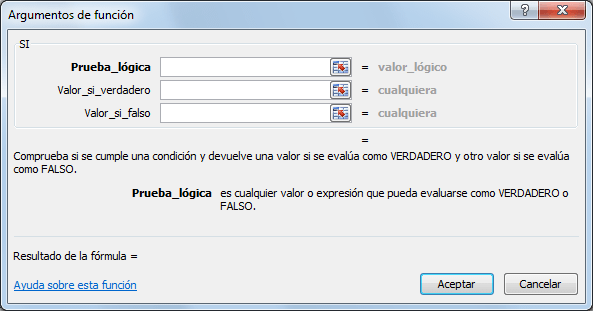 La función SI tiene un claro carácter lógico. Evalúa si se cumple o no una determinada condición (prueba_lógica) y en función de ello devuelve un resultado (valor_si_verdadero) u otro (valor_si_falso). Como vemos en la imagen anterior, de la prueba lógica sólo pueden salir dos resultados: el verdadero o el falso.