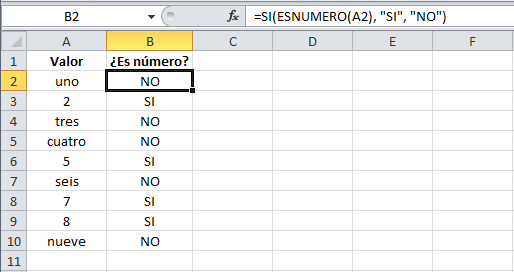 Es posible utilizar el resultado de otra función como la prueba lógica que necesita la función SI siempre y cuando esa otra función regrese como resultado VERDADERO o FALSO. Un ejemplo de este tipo de función es la función ESNUMERO la cual evalúa el contenido de una celda y devuelve el valor VERDADERO en caso de que sea un valor numérico. En este ejemplo quiero desplegar la leyenda "SI" en caso de que la celda de la columna A efectivamente tenga un número, de lo contrario se mostrará la leyenda "NO".