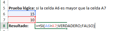 En este ejemplo queremos saber si la celda A6 es mayor que la celda A7. Para ello escribimos la función que podemos ver a continuación.