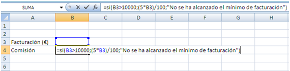 - Si por el contrario B3 < 10.000 (por ejemplo B3 = 8.000), en B4 podremos leer: No se ha alcanzado el mínimo de facturación.